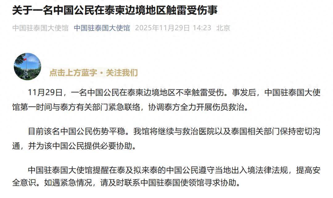 11月29日,一名中国公民在泰柬边境地区不幸触雷受伤。事发后,中国驻泰国大使馆第一时间与泰方有关部门紧急联络启运配资,协调泰方全力开展伤员救治。