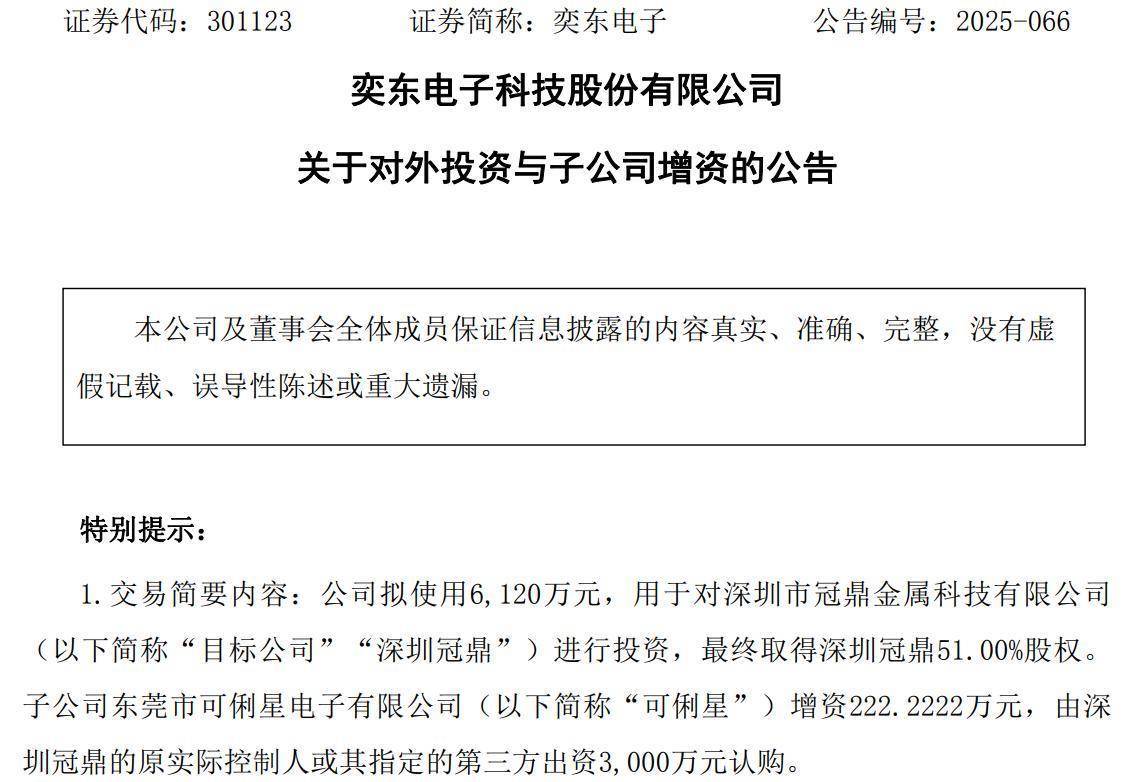 11月26日晚间乾富策略,奕东电子(301123)公告称,公司拟使用6120万元对深圳市冠鼎金属科技有限公司(以下简称“深圳冠鼎”)进行投资,最终取得其51.00%股权。子公司东莞市可俐星电子有限公司(以下简称“可俐星”)增资222.2222万元,由深圳冠鼎的原实际控制人或其指定的第三方出资3000万元认购。