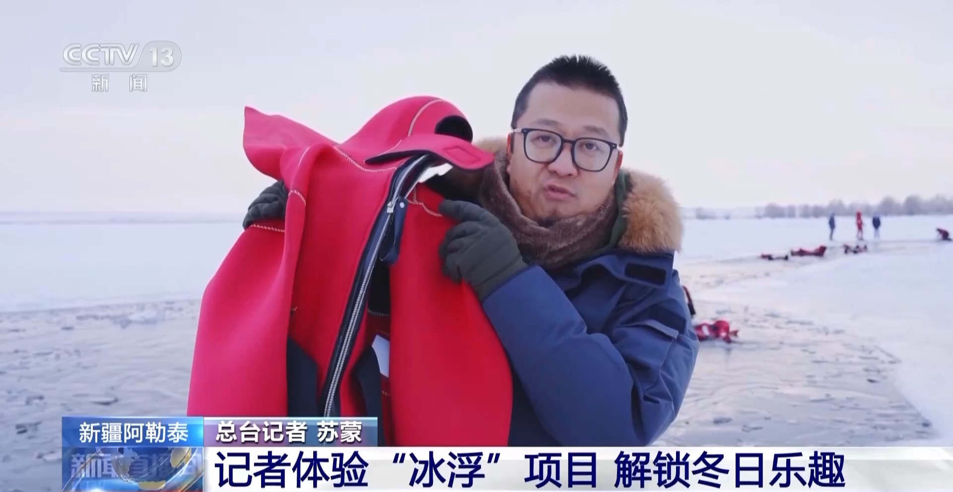 总台记者 苏蒙:要体验这样的运动,装备是必不可少的。我手上拿着的冰浮衣重量在5公斤左右,只要您的身高在1米92之内,体重在120公斤以内就可以穿上这样的冰浮衣来体验。因为它是特殊材料制成的,即使在冰水里面,也能够保证30分钟之内身体不会发生失温的现象。现在我就要穿上这套装备,和游客一起去体验独特的冰浮运动。